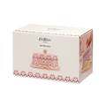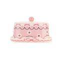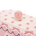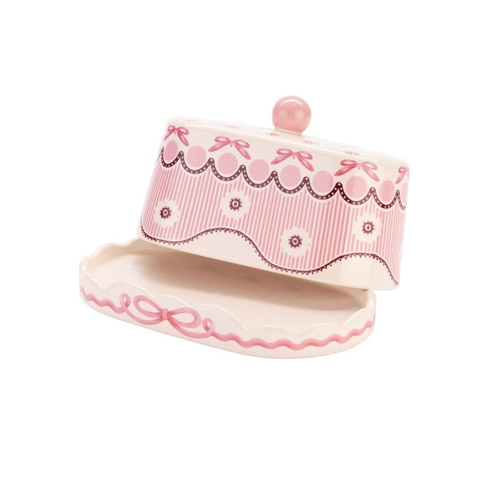 The butter dish itself compromises of both the base plate, which features a dish and cover. The dish an elegant, rounded rectangle with scalloped edge and a wavy pink painted ribbon with bow. The cover has a striking pink pattern, with a maroon wave rippling around white spots, pink dots and bows. Pink vertical stripe forms a band around the middle, accented with white flowers and a decorative wavy border beneath it. Ideal for holding a block of butter, the dish comes with a cover topped with a pink knob, making it easy to cover and uncover. Beautifully set against the delicate white background of the stoneware, it is a charming dish for serving butter with your breads.