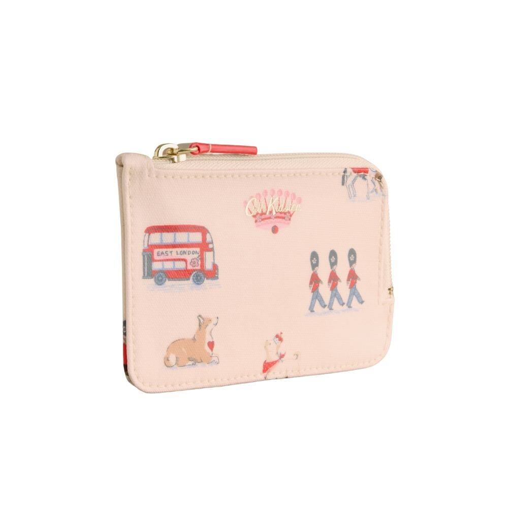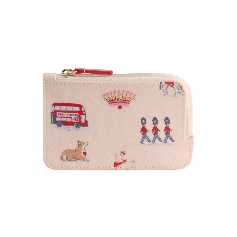 Stay organised with the Cath Kidston Card and Coin Purse in the cheerful Queenie's Ditsy print, a wonderfully compact accessory designed for your daily essentials. This lovely design gives iconic London a classic Cath twist, featuring beloved characters illustrated with heart and personality, including marching guardsmen, a double-decker bus, and Stanley and friends in various playful poses. Set against a soft cream background, the archival-style print is complemented by a vibrant red zip pull and a secure gold-tone zip closure. Perfectly sized for life on the go, this purse is a joy to use for keeping your cash and cards safe and tidy.