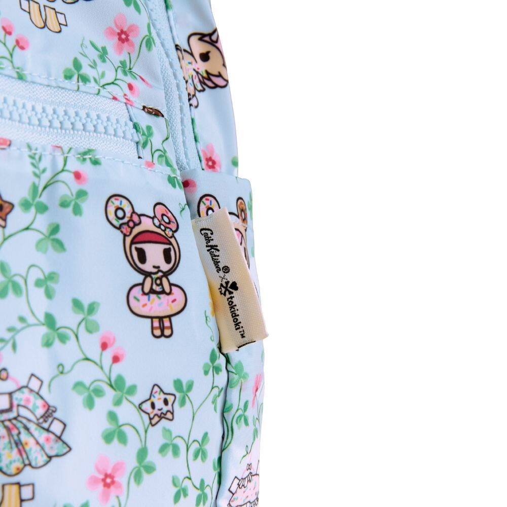 Celebrating the exciting and unexpected collaboration between two creative worlds, this Cath Kidston x Tokidoki Foldaway Backpack features the playful Paper Dresses print in a lovely blue colourway. The print showcases Donutella and friends among a delicate lattice of blossoms, alongside sweet miniature paper dresses ready for them to choose. Made from durable PVC coated cotton, this backpack is perfect for travel or shopping thanks to its innovative foldaway design. It is complete with a two-way zip closure for easy access, a top grab handle, adjustable shoulder straps for comfort and a handy front pocket for essentials.