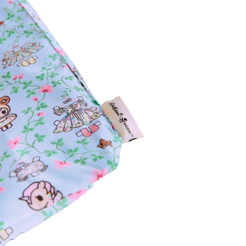 A perfect shopping trip companion, the durable Cath Kidston x Tokidoki Foldaway Shopper Bag is beautifully lightweight. Featuring the utterly charming Paper Dresses print in blue, we see Donutella, Chocotella and Dolce sweetly resting amongst a delicate lattice of blossoms. Between them hang their lovely Cath Kidston dresses filled with pretty patterns, ready for them to choose. This mini bag is designed to fold away and take out as needed, making it super handy for any smaller spontaneous purchases.