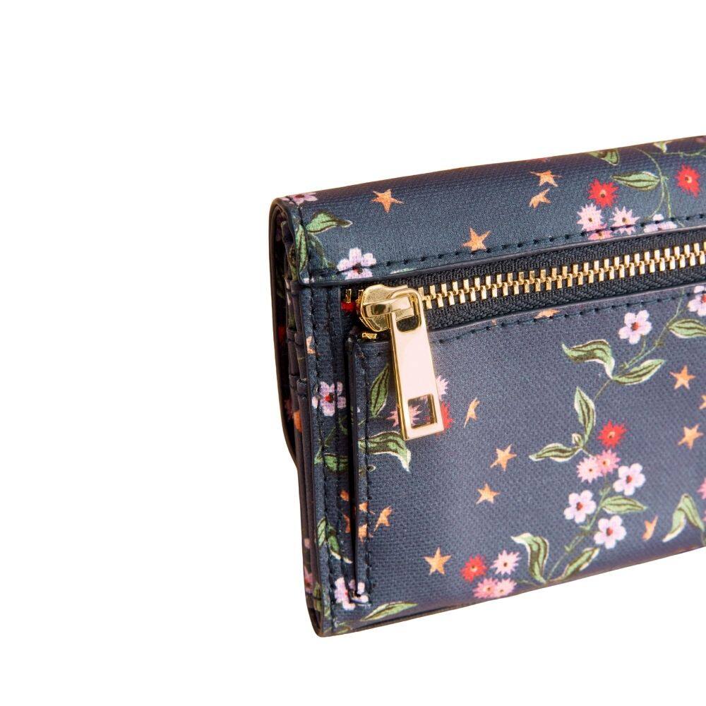 Safeguard your essentials in the compact Trailing Star Sprigs Folded Wallet by Cath Kidston. This wallet is a little piece of night sky magic, featuring a trailing floral print where starlit sprigs dance gracefully amongst delicate blossoms. Designed for everyday ease, this wallet is perfectly sized for your smaller bags. Open it up to find multiple card slots, and a secure zipped pocket for your coins, keeping everything organised and close at hand. It's a charming and practical accessory that combines the functionality you need with the whimsical style you love.