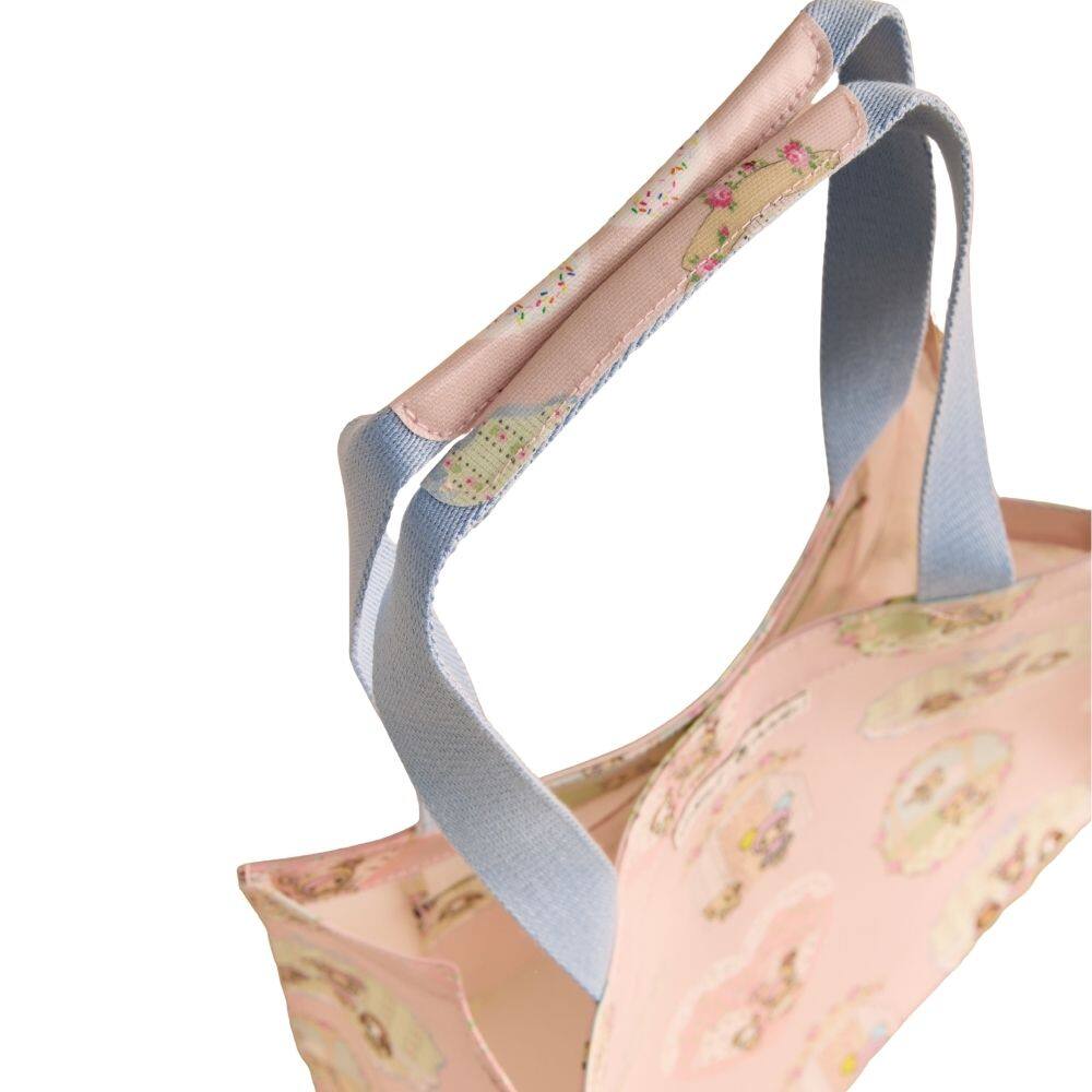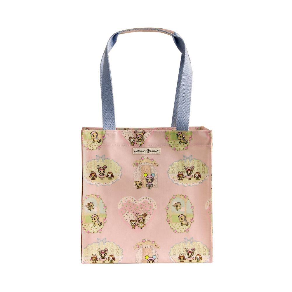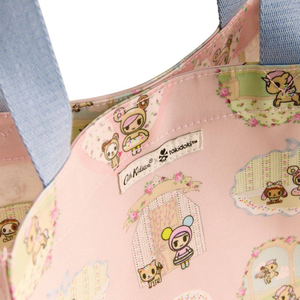 One of Cath Kidston's most-loved shapes, the Cath Kidston x Tokidoki Town Medium Bookbag is an everyday piece that combines beauty and function. The print features captivating little vignettes and hearts where Donutella, one of Simone Legno's cult-iconic characters, is perfectly integrated into the sugary pink background and romantic, hand-painted Cath Kidston elements. Its lightweight design makes it ideal for running errands, while the signature shiny coated cotton exterior ensures it is durable and easy to care for. Finished with contrasting blue handles, this bookbag is a bold, colourfully characterful accessory that captures the unexpected joy of the collaboration.