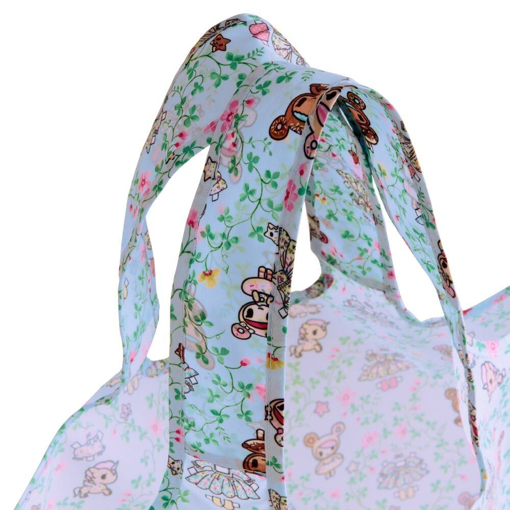 A perfect shopping trip companion, the durable Cath Kidston x Tokidoki Mini Foldaway Shopper Bag is beautifully lightweight. Featuring the utterly charming Paper Dresses print in blue, we see Donutella, Chocotella and Dolce sweetly resting amongst a delicate lattice of blossoms. Between them hang their lovely Cath Kidston dresses filled with pretty patterns, ready for them to choose. This mini bag is designed to fold away and take out as needed, making it super handy for any smaller spontaneous purchases.