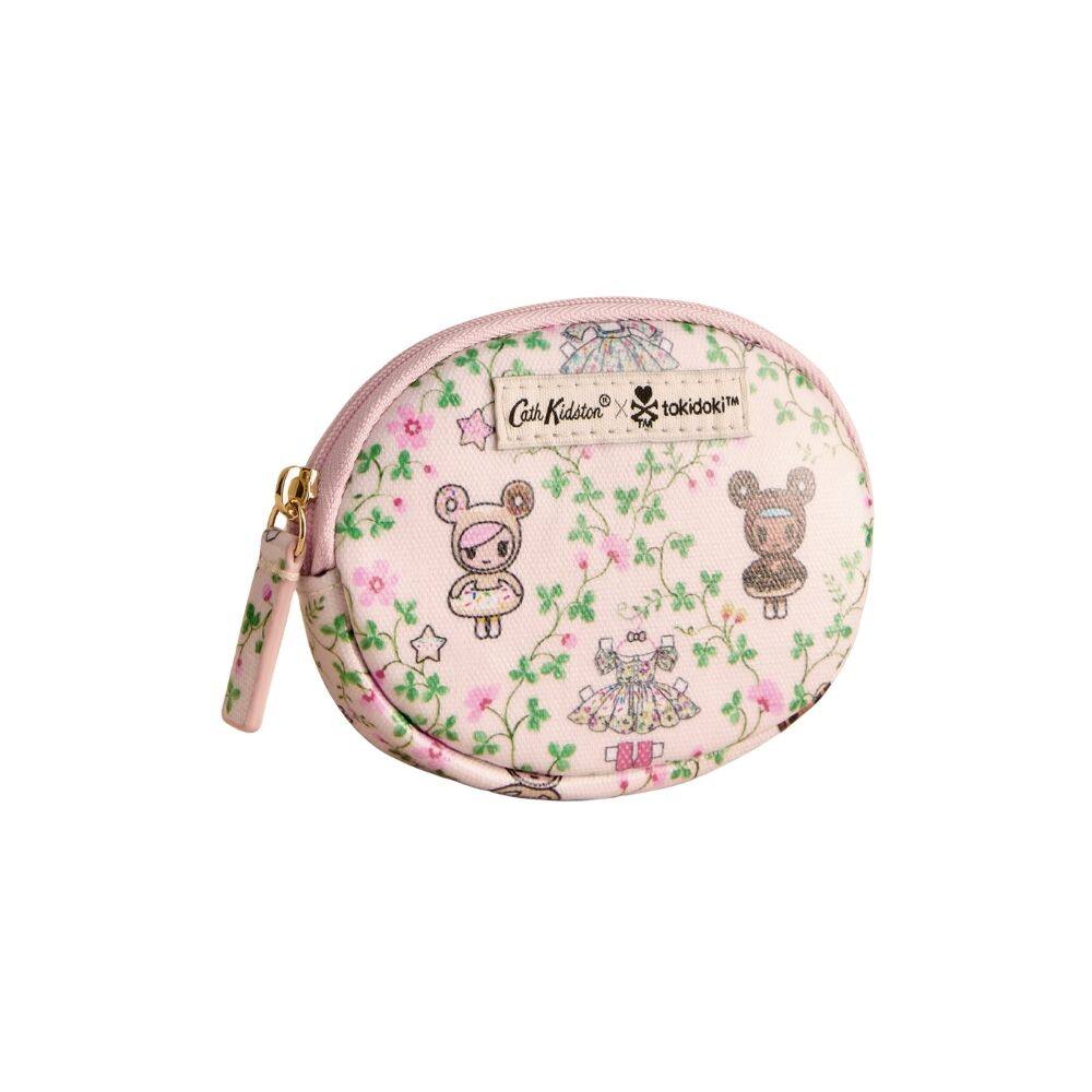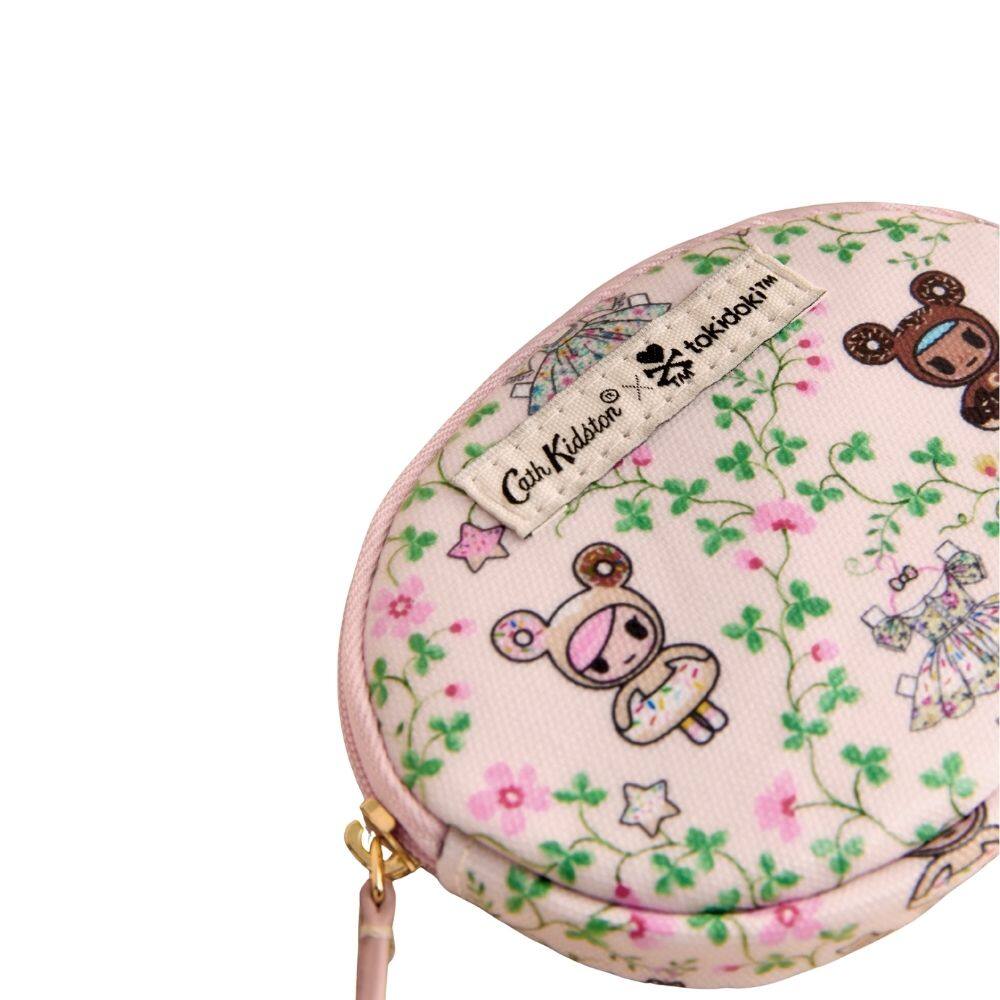 This charming oval coin purse is a delightful piece from the Cath Kidston x Tokidoki collaboration, merging the romantic hand-painted style of Cath Kidston with the cult-iconic characters of artist Simone Legno. Featuring the sweet Paper Dresses print, the design showcases Tokidoki favourites Donutella and Chocotella resting amongst a lattice of delicate pink blossoms. Their adorable miniature Cath Kidston dresses, filled with pretty patterns, hang ready to be chosen, creating a playful and whimsical scene. Crafted from shiny coated cotton, this compact oval purse is secured with a zip closure and is perfectly sized to slip easily into your pocket or bag for keeping your change tidy.