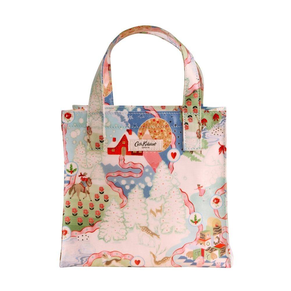 A mini version of a much-loved original, the Small Coated Bookbag from Cath Kidston hosts all the same features but in a smaller and more convenient size. This signature silhouette is the perfect way to bring some festive magic to your daily carry with the enchanting Christmas Journey print. This is more than just a bag; it's a hand-painted, nostalgic board game that tells a new story every time you look at it. Watch as beloved Cath characters embark on their journey home for Christmas. Which route will they take and which festive scenes will they discover? From snowy landscapes to cosy cottages and charming village details, this bag captures the heartwarming spirit of the holiday season. The wipe-clean exterior, thanks to the PVC-coated shiny cotton, makes it hassle-free to care for. It’s the perfect companion for carrying your essentials, a gift or two, or simply adding a touch of festive cheer to your outfit. The durable coated cotton makes it both beautiful and resilient, so you can carry your belongings and a little bit of holiday wonder wherever you go.
