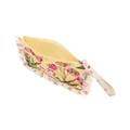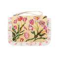 A little pouch for days out and joyful soirées, this beautiful 100% cotton Frill Wristlet Pouch is adorned with our elegant hand-painted Floral Fancy print. Framed with a ruffle trim, it has a little slip pocket for cards, and with its detachable wristlet strap you can either hang it on your wrist or use it as a clutch.