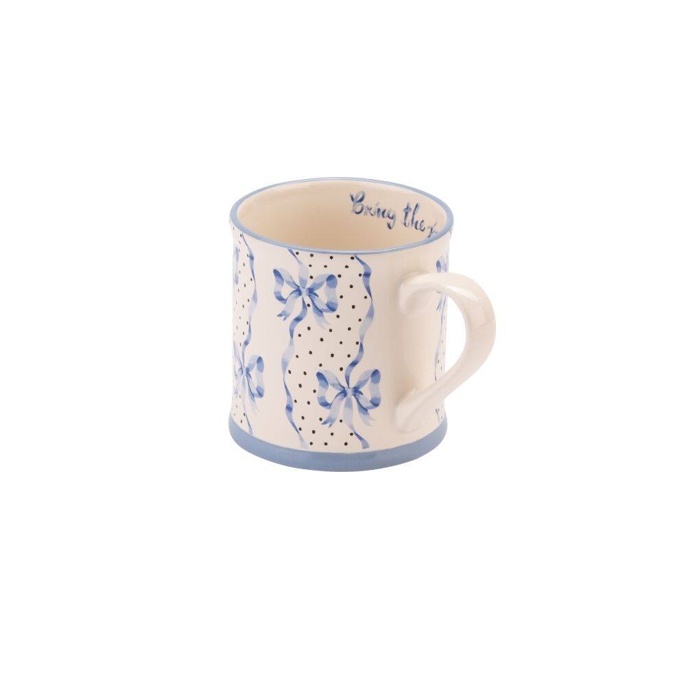 Brighten up tea time with the Bring the Joy Blue Mollie Mug. Featuring a ‘Bring the Joy' sentiment and bow decal on the inner rim, this mug boasts a contrasting handle for an elegant finish. Dishwasher and microwave safe.
