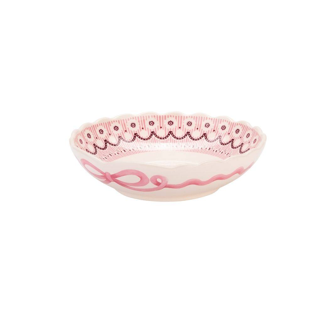 This pasta bowl features the vintage elegant Spitalfields Silk design. The inside of the bowl showcases a decorative pink pattern, with a deep maroon wave rippling around white spots, dots and flowers. Dainty sprigs repeat beneath it, all set against a pastel pink vertical stripe background, creating a striking border that frames your meal in the centre. Around the outside is a charming painted pink wavy ribbon with a classic bow, creating an elegant look that complements the design inside. The dish is finished with a scalloped edge for a subtle elegant style.