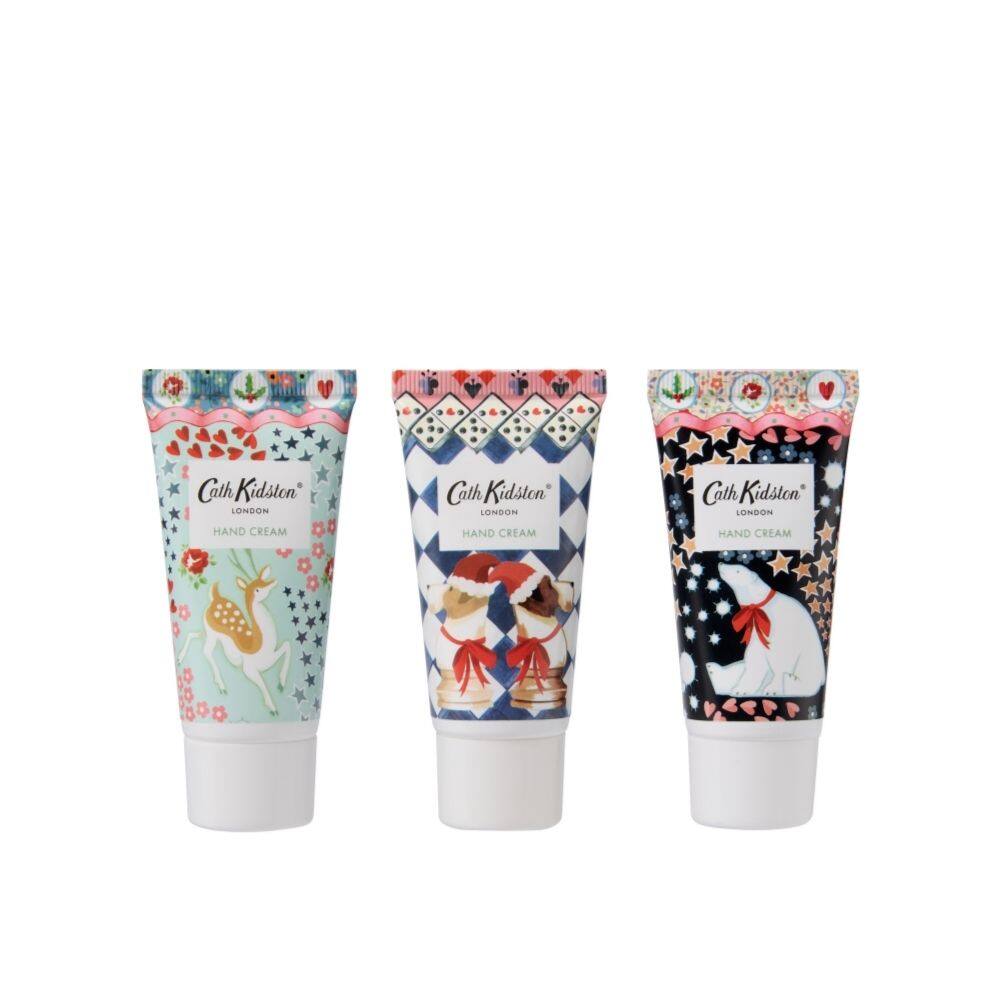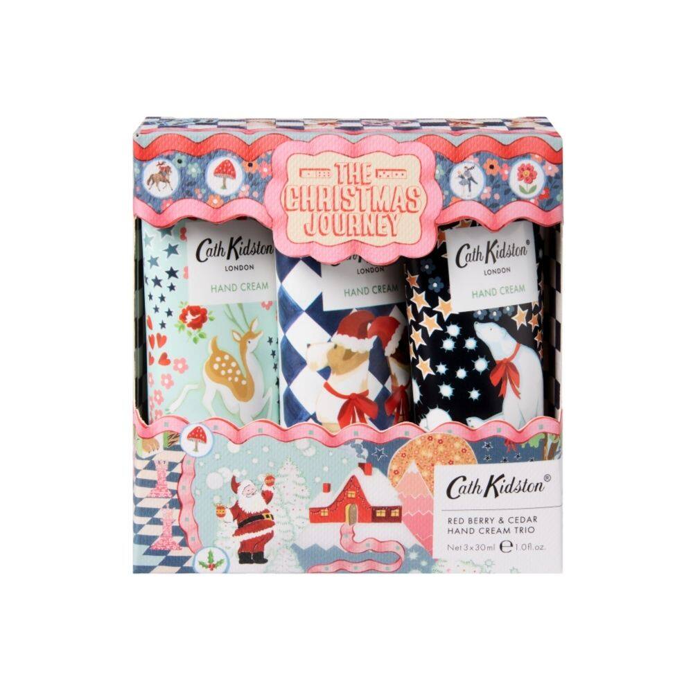 A cheering trio of Red Berry & Cedar Cath Kidston hand creams with essential oils of juniper and fir. Decorated with miniature Santa, cute dogs in Santa hats, polar bears and reindeer. A perfect stocking filler and small beauty gift, sure to bring a smile.
