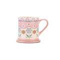 Designed in the Spitalfields Silk pattern, this stoneware mug has a capacity of 275ml. With a soft pastel pink, cream and blue colourway, the unique pattern blends classic florals with gentle waves and stripes, creating a layered, decorative look that feels both timeless and playful. A maroon wave with white spots, pastel blue dots and pink bows circles the rim, while beneath it a pink-and-white stripe is scattered with white flowers. The lower half of the mug is adorned with clusters of blue flowers above a single stem with two frilly leaves, repeating in an alternating pattern with clusters of yellow and orange flowers. The base is finished with a sleek pink edge that matches the handle. Inside the rim, a single blue flower repeats around the circumference.