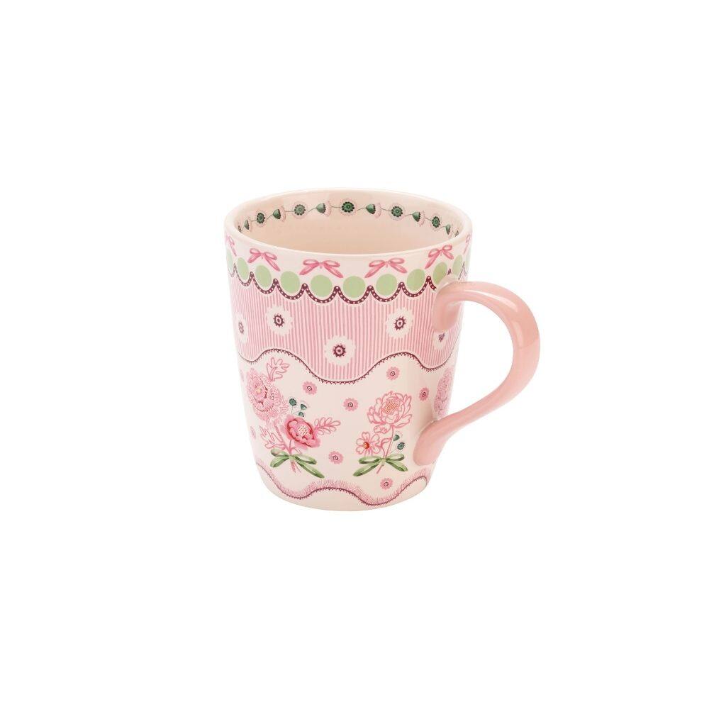 Made from stoneware, the classic Stanley mug has a sleek elegant shape which tapers in toward the base. Holding 375ml of your favourite beverage, this mug is ideal for a variety of teas, coffees or a luxurious hot chocolate filled with cream and marshmallows. Featuring a variety of patterns and florals, the mug is decorated with a maroon wave at the top, accented with white spots, green dots and pink bows, while beneath it a pink-and-white stripe is scattered with white flowers. “The lower half of the mugs is adorned with bouquets of pink flower blooms with painted leaves, tied together with a green bow. A scattering of mini pink flowers is interspersed, and a purple frilly wave ripples around the base edge. All are set against the cream stoneware, allowing the colours and unique pattern to stand out. The inside is decorated with an adorable daisy chain running around the circumference of the rim, while the handle is a soft pink that effortlessly complements the exterior pattern.