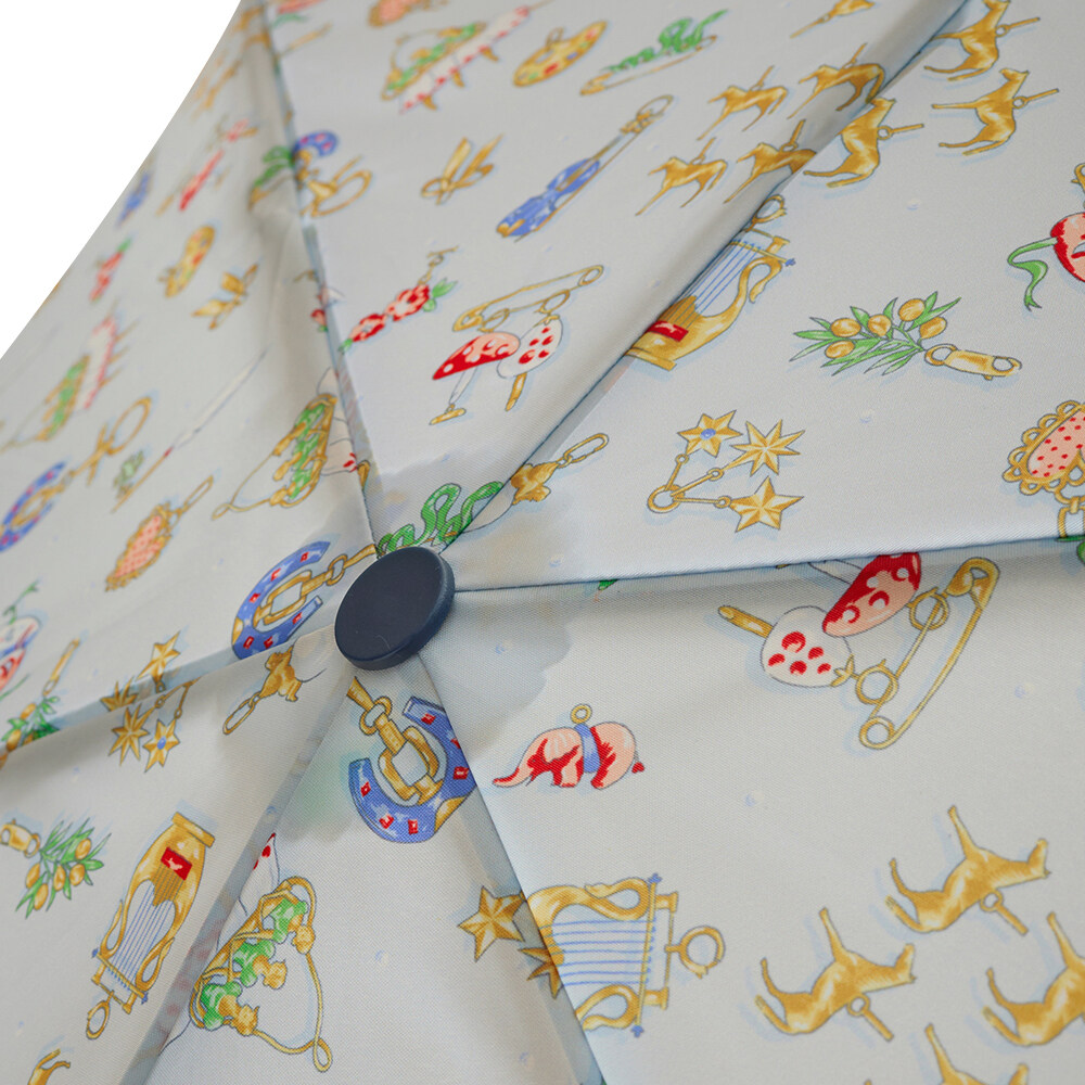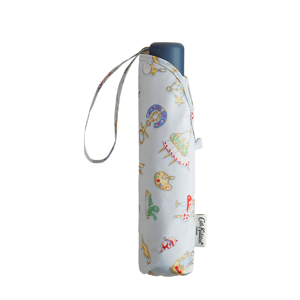 Brighten the greyest of days with this Charmed Umbrella by Cath Kidston. This hand-painted print honours the Greek Goddesses of the Arts from our Nine Muses collection. Each charm lovingly inspired by their talents, told with story-telling flair on a charming Light Blue Ground. The compact design is made from a strong, lightweight and rust proof frame with a large canopy and high performance polyester fabric. Stay smiling and dry. Compact umbrella Wrist strap Comes with case
